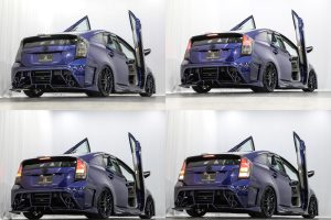 プリウス S ガルウィングキット/自社オリジナルブラックファング/KUHLリアバンパー/オリジナルバルカンRGBカラーアイヘッド/青黒インテリア/キャンディーブルー新品19インチAW/コンプリートフルカスタム